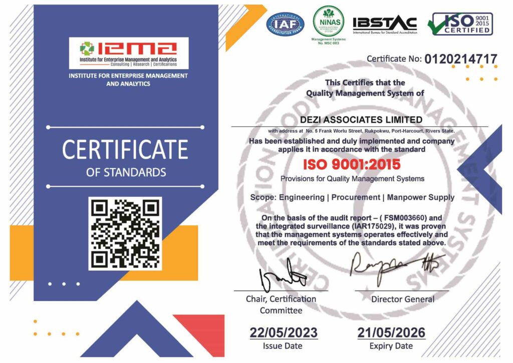 Dezi Associates Ltd is dedicated to providing quality products and associated services to satisfy the needs of our customers. We are ISO 9001:2015 / 0120220027 certified and dedicated to meeting these international quality standards, along with all relevant legal and third-party requirements. To verify compliance with the requirements of these certifications and drive continuous improvement, we engage in routine management reviews, performance analysis, customer satisfaction, and internal