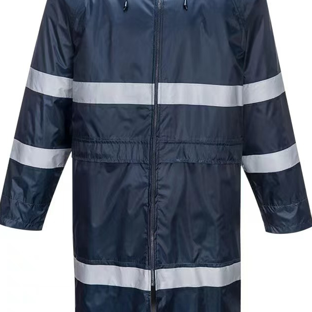 Design: | One piece, hidden hat with coat, placket with zipper to close, front with pockets,around the body and sleeve with high visibility reflective strip, back with breathable holes. |